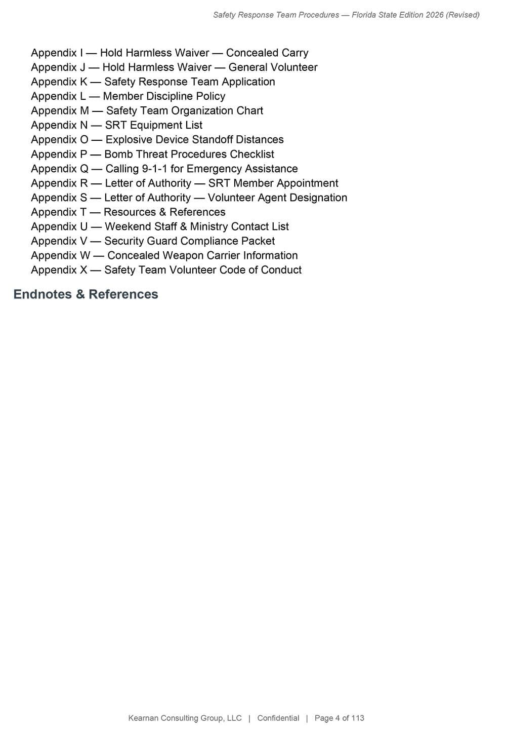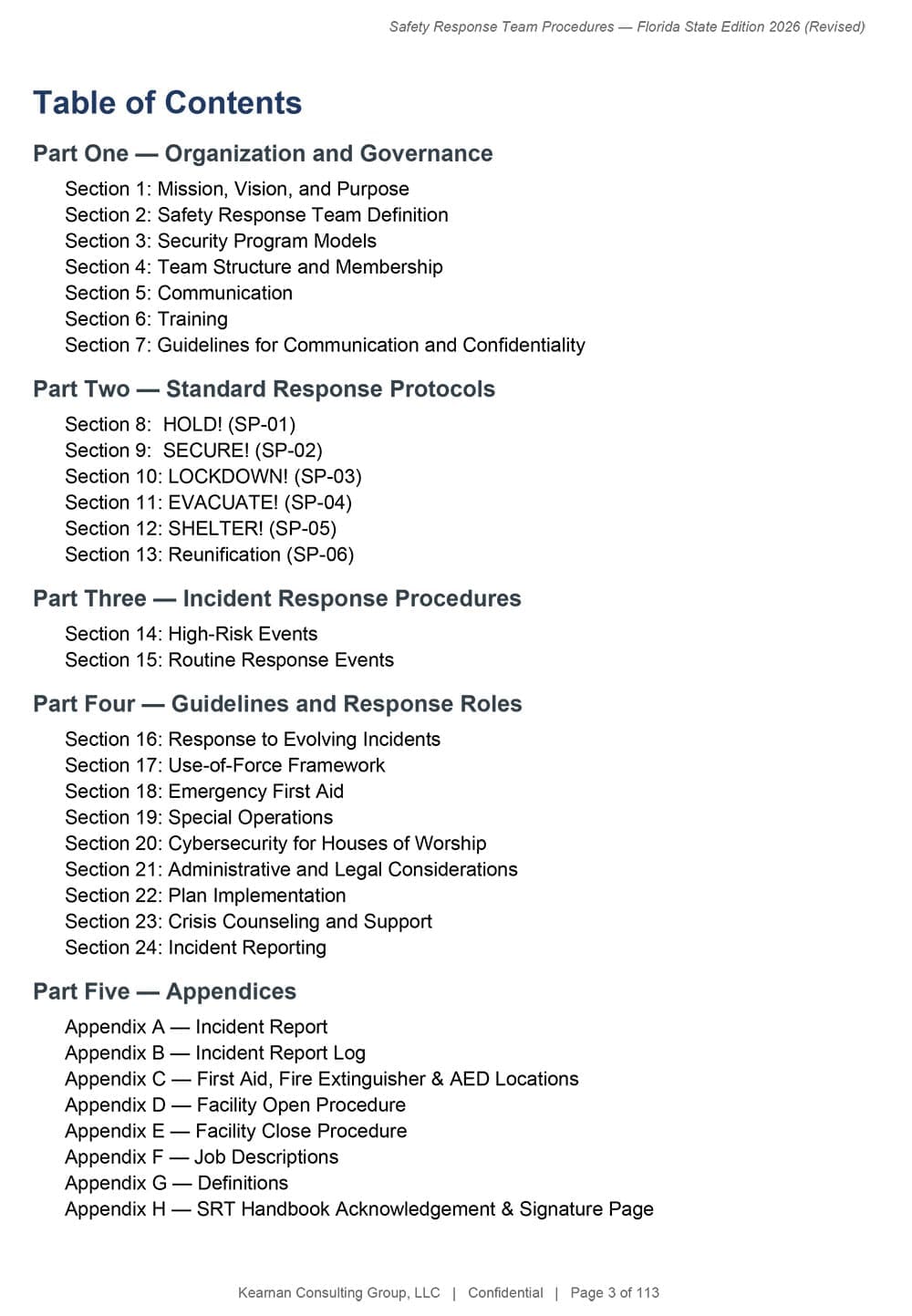 A complete, 72-page training curriculum designed to build and sustain an effective Safety Response Team. Organized across Foundations, Unarmed, and Armed tiers, it includes lesson plans, a 9-module unarmed certification program, assessment rubrics, administrative templates, and an annual training matrix. Grounded in a ministry-first approach and supported by FEMA, CISA, and ASIS International standards.
