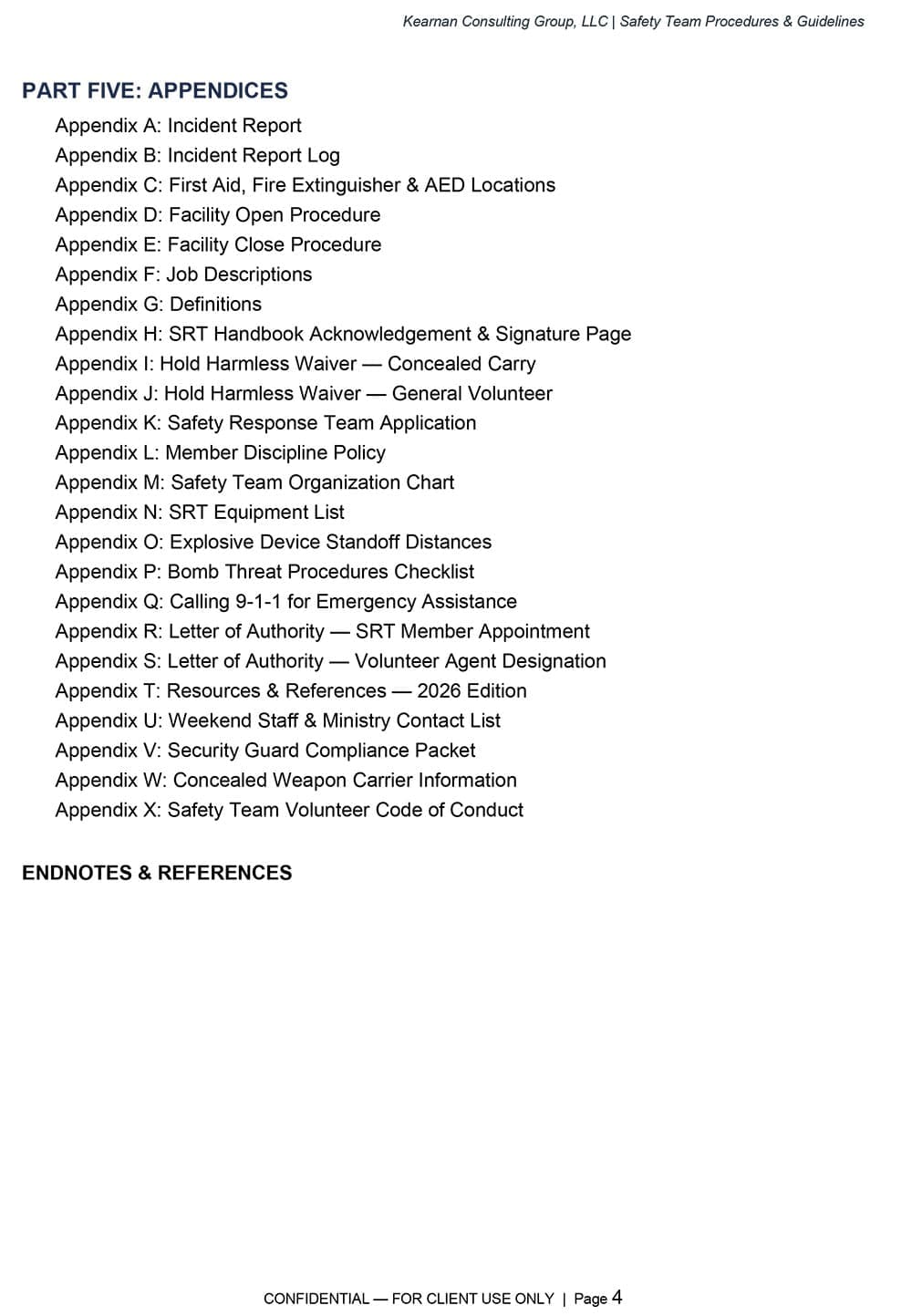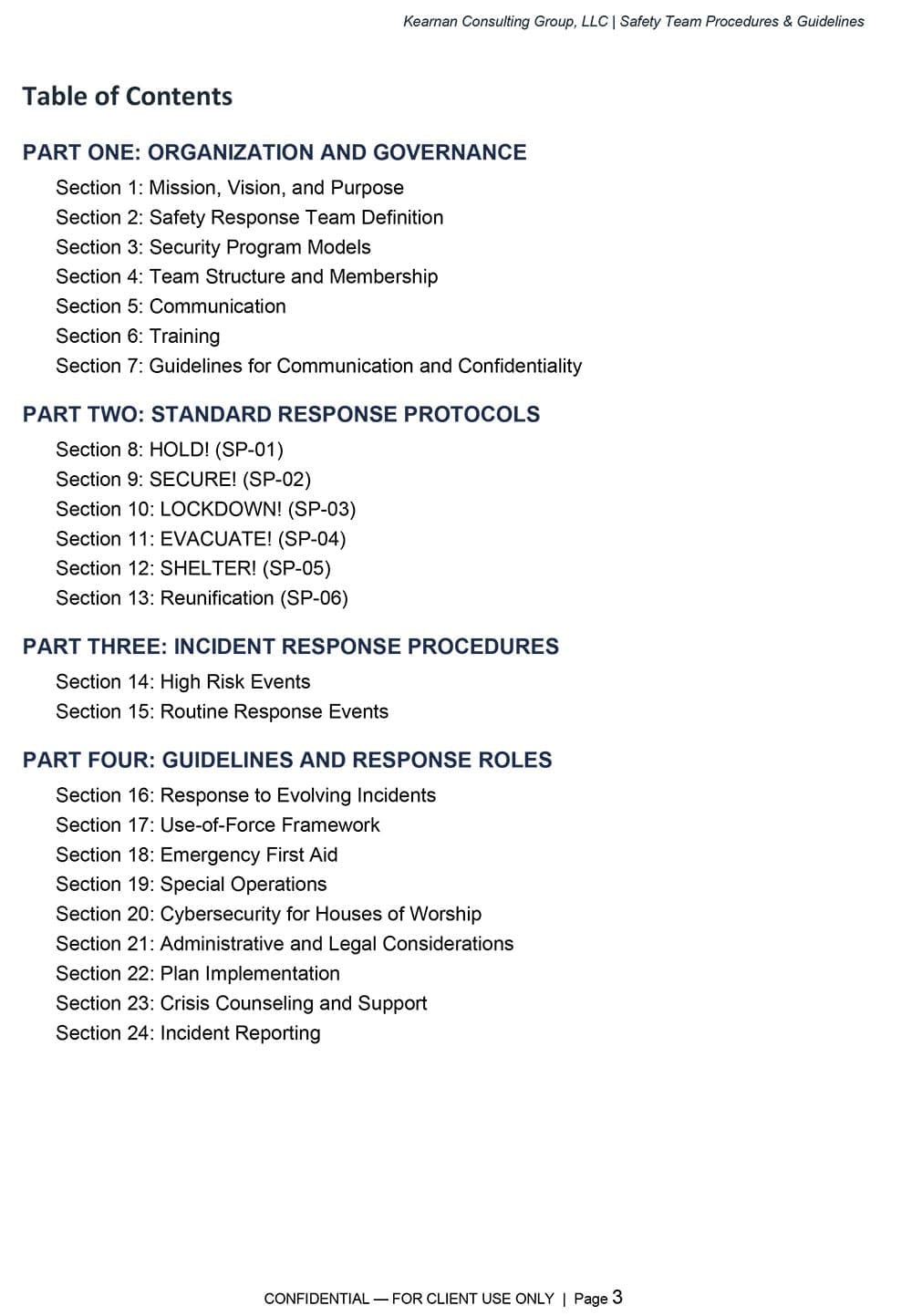 A complete, 72-page training curriculum designed to build and sustain an effective Safety Response Team. Organized across Foundations, Unarmed, and Armed tiers, it includes lesson plans, a 9-module unarmed certification program, assessment rubrics, administrative templates, and an annual training matrix. Grounded in a ministry-first approach and supported by FEMA, CISA, and ASIS International standards.